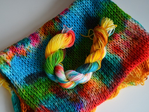 Die übrig gebliebenen Farben hab ich auf einen Strang verteilt, wäre doch zu schade die Farben weg zu schütten.